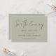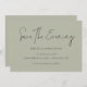 Manuscrito Minimalista Pálido Verde Salve A Noite. Disponível digitalmente e impresso. Simples elegância para enviar aos seus convidados da noite. Salvar A Noite está em um script de conjunto moderno.O resto do texto que você pode personalizar facilmente.Mostrado aqui em preto no verde Sage, entretanto, as cores de texto e plano de fundo podem ser alteradas se você desejar por meio da opção personalizar mais.