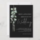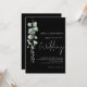 Sage Eucalyptus Modern Script Black Wedding. Estilo botânico moderno, com um conjunto de roteiro manuscrito para o casamento e o resto do texto que você pode personalizar facilmente, que está em branco sobre um fundo preto. Um galho elegante de folhas de aquarela eucalipto corre pelo lado esquerdo. Você pode alterar a cor do texto e os planos de fundo pretos em cada lado, se desejar por meio da opção editar mais.