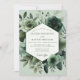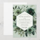 Embrace a sophisticated and elegant mood with this stunning botanical design. A lush arrangement of monochromatic green florals, including soft roses and striking anemones, creates a harmonious composition. The palette of sage, olive, and deep forest green offers a uniquely romantic and moody atmosphere for your special day's stationery.