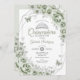 Sábio verde, prata e convite para comemoração da Quinceanera branca. Recursos, fontes de script, borboletas, rosas verdes de aquarela e tiara. Perfeito para uma elegante celebração de glam estilo princesa. Personalize com seus próprios detalhes. Impressos convites Zazzle ou modelo de impressão digital instantânea para download.