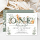 Este elegante convite para primeiros aniversarios apresenta cor d'água macia verde, animais florestais adoráveis e cartazes modernos.