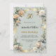 Um fundo verde sábio. Decorados com os florais brancos e amarelos e uma fita de ouro. Personalize e adicione seu nome, idade e detalhes.