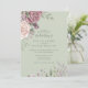 Um elegante design de aquarela de grandes rosas em tons de rosa claro sobre um fundo verde sábio. A parte traseira do cartão tem um pequeno arranjo floral no centro. Você pode adicionar detalhes no menu "editar design". Este convite é parte de uma bela suíte de casamento que pode ser totalmente personalizada.