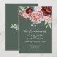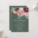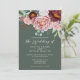 Um design elegante de aquarela com grande peônia e rosas em tons de rosa empoeirado com verde eucalipto em um fundo verde sálvia. A parte de trás do cartão tem o fundo verde sálvia com um pequeno arranjo floral no centro. Este convite lindo faz parte de um conjunto de casamento que pode ser totalmente personalizado.