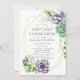 Trendy suculenta o primeiro convite da comunhão sagrada com moldura geométrica dourada e lavagem de cor verde-d'água invertida.