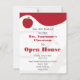 Um convite com um esquema de cores vermelho e branco. A frente apresenta design vermelho no topo e ilustração da maçã vermelha no topo à esquerda. Fundo de rotação. Personalize com o nome do professor, a nota, a localização e a data das suas costas para a orientação da casa aberta da escola. O lado oposto é vermelho sólido.