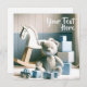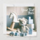 Um quarto de criança confortável e encantador com um ursinho de pelúcia de cinza macio, um cavalo de balanço de madeira branco e azul e vários blocos de construção azul e branco. A sala é decorada em uma paleta calorosa de tons azuis e brancos, proporcionando uma atmosfera calma e convidativa para brincar e relaxar