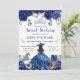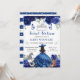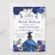 Um convite encantador de Sweet Sixteen azul apresentando uma princesa morena ao estilo de salão em um vestido de baile fluido, cercada por rosas azuis e roxas exuberantes, borboletas e detalhes cintilantes prateados suaves. Elementos country-chic como a silhueta de cavalo prateado, botas de cowgirl florais e ferradura adicionam um toque único e elegante, mantendo o design sofisticado e comemorativo. Um delicado motivo de tiara coroa o layout, e a tipografia moderna de fontes mistas destaca a celebração de um marco com um visual polido e feminino. A paleta azul rica, toques ocidentais caprichosos e a silhueta graciosa de princesa criam um convite mágico e sofisticado, perfeito para uma celebração inesquecível de Sweet 16.