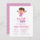 Salta para a Joy! É um dia especial! Este convite tem uma garota bonita com rabos de pônei batendo na palavra Salto até que as letras U e M sejam comprimidas. Este convite é perfeito para festas realizadas em parques infantis e casas soltas. Paleta colorida de pinks e roças faz este excelente de convite para garotas de aniversário! Personalize facilmente com os detalhes do seu partido.