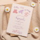 Cartão de convite de aniversário de menina giro, com ilustração pastel rosa e roxo de sapos. O texto diz "salto por cima".