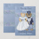 Noivos ursinhos de pelúcia adoráveis. Este casal bonito está vestido com suas melhores roupas de casamento. Ele com seu smoking e cartola e ela com seu vestido de noiva e véu. O belo fundo azul claro tem um motivo floral discreto com uma bela borda de acento floral detalhada na frente e atrás. Todo o texto está pronto para você personalizar.