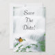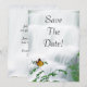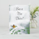 Cartão de salvar a data com um design de borboleta e cascata. A cascata tem uma aparência suave e sedosa e a borboleta paira sobre uma flor em primeiro plano. Bela temática da natureza para o seu casamento de primavera ou verão. Este design vem em muitos outros produtos de papel para atender às necessidades do seu conjunto de casamento.
