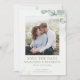 Cartão elegante de "save the date" de casamento com eucalipto em aquarela, frente e verso. Com folhas de eucalipto em aquarela. Este modelo de design apresenta um layout com uma foto.