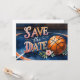 Arremesse para o amor! Este vibrante e esportivo cartão de Salvar a Data apresenta uma bola de basquete em uma quadra, capturando perfeitamente o seu casamento ou celebração de noivado com tema de basquete. Projetado em um estilo de aquarela brilhante e enérgico, é ideal para casais que compartilham uma paixão pelo basquete.
