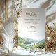 Anuncie o seu casamento com este charmoso cartão "Salve a Data", com uma representação pitoresca do Vale do Douro, Portugal. O cartão apresenta uma bela mistura de matizes pastéis macios, incluindo verde-luxuoso, azul-tranquilo e bege-sujo. O detalhado trabalho de arte de aquarela capta a essência dos vinhedos rolantes do Vale do Douro e do rio sereno, evocando um senso de romance e elegância. Perfeito para casais planejando um casamento de destino, este cartão define um tom sofisticado e convidativo para seu dia especial. Personalize com seus detalhes de casamento para criar uma impressão inesquecível.