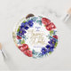 Arranjo floral aquoso de flores azuis/púrpuras profundas complementado com flores vermelhas. Salve a Data em um guião de ouro caprichoso com corações desenhados à mão. Data, nomes e outras informações são personalizáveis. Opção de foto atrás.