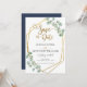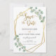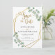 Este convite de salvar a data de casamento sofisticado apresenta uma moldura geométrica dourada adornada com bela folhagem de eucalipto em aquarela e tipografia de pincel em folha dourada. Projetado para combinar com nossa coleção de casamento de Eucalipto Prata. Personalize-o com seus detalhes facilmente e rapidamente, basta pressionar o botão personalizar para reorganizar e formatar o estilo e a colocação do texto.