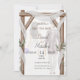 Um convite de casamento elegante com um arco de madeira rústica, cortinas brancas e um cabeçalho "Bismillah".