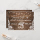 Este design apresenta um fundo de madeira rústica com luzes de corda penduradas, bela renda e antigos potes de pedra e flores. Personalize isso para qualquer ocasião, mas ótimo para um aviso de data para um próximo casamento no campo!