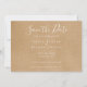Esta foto rustic hand script salve o cartão de data e apresenta a sua foto e um script salve a data acima dos seus nomes, data e local. O inverso tem detalhes adicionais sobre a data, incluindo o site do seu casamento em um fundo kraft rústico. Projetado por Thisnotme©