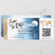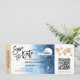 Avião Dourado de Casamento de Praia de Destino Embarque Bilhete de Passagem Salve a Data com Ícone de Navio de Cruzeiro com folhas tropicais. Adicionar seu código QR