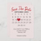 "Salve o calendário" com coração vermelho no fundo cor-de-rosa para o próximo casamento. O texto é editável. O mês pode ser mudado. Coloque o coração vermelho na data do seu casamento.