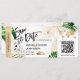 Avião Dourado de Casamento de Praia de Destino Embarque Bilhete de Passagem Salve a Data com Ícone de Navio de Cruzeiro com folhas tropicais. Adicionar seu código QR