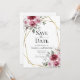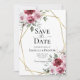 Cartão de save the date de casamento floral com aquarela pintada à mão com buquês de flores rosa desbotado e borgonha com folhagem e moldura de folha de ouro digital. Você pode personalizar as palavras, o estilo da fonte, a cor e o tamanho na frente e no verso do convite. Este cartão de save the date de casamento é parte de um conjunto completo de casamento com papelaria correspondente.