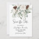 Natal Salve O Convite De Casamento no inverno Floral Do Pine. Este elegante casamento no inverno Salve a data é decorado no topo com um buquê de Natal rústico de verde aquarela e cones de pinho, e apresenta uma caligrafia moderna de escrita manual de tendências.