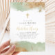 Um convite de batismo moderno com sálvia em aquarela e uma cruz com brilho dourado falso. O produto perfeito para o batismo ou batizado dos seus meninos.