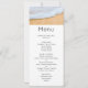 Menu de eventos com uma fotografia de uma praia ouro marrom arenosa com surf branco de espuma.