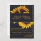 Fácil de personalizar o convite de casamento moderno com um vibrante buquê de girassóis pintados manualmente com um roteiro de caligrafia de tendência e duas listras escuras de marinho azul e ouro sobre um fundo azul escuro da meia-noite. +++++++++ Adequado para o verão floral ou outono, para as comemorações e recepções de casamentos no exterior do jardim noturno ou do estilo rústico do quintal.