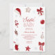 Santa Baby! A festive Christmas themed Baby Shower invitation featuring red and white christmas graphics - santa hat, presents, bow, stocking, candy cane, star, tree, baube, snow flake, misletoe.