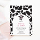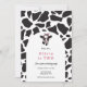 O convite de aniversário divertido apresenta um padrão de vaca com uma ilustração legal de vaca. Excelente para todas as idades! Personalize com suas informações ou clique em "Clique para personalizar mais" para editar estilos de fonte, tamanho e cores.
