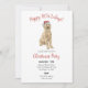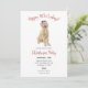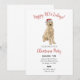 These customizable Christmas party invites feature a watercolor style portrait of a golden doodle wearing a santa hat.