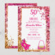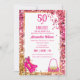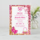 Moderno e elegante, para o convite de aniversário da fashionista de 50 anos. Quadro de confetes rosa neon brilhantes de luxo glamoroso feminino, um par de sapatos de salto alto 👠 com laços sentados no canto esquerdo e uma bolsa cor-de-rosa dourada colorida e fofa 👛 sentada no canto inferior direito, "50 & Fabuloso" escrito em rosa neon fuchsia em fundo branco. Você pode facilmente alterar seu nome e endereço, fontes, cor, tamanho e número da idade clicando nas opções de personalização da Zazzle.