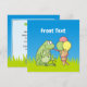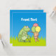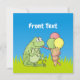 Sapo sorridente rouba um cone de sorvete com sua língua sobre grama verde sob o céu azul.