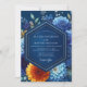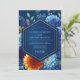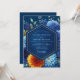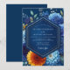 A dramatic botanical arrangement unfolds against a deep navy blue background. Luminous sapphire, sky blue, and white dahlias create a stunning visual contrast, accented by a single, vibrant marigold bloom. Delicate buds and soft green foliage are scattered throughout, adding depth and a touch of artistic elegance to this striking design.