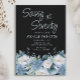Azul poeirento e floral branco no convite de aniversário preto "Sassy at Ssety" 70. Entre em contato comigo para obter assistência com a personalização ou para solicitar correspondência ou coordenar produtos Zazzle
