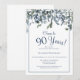 Alegria a 90 Anos de Convite Floral Azul Este convite divertido apresenta videiras e flores azuis e verdes, letras escritas à mão e tipografia clássica.