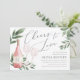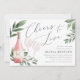 Planejar um tema de vinho ou chá de panela de vinho, ou acolher o grande evento em uma adega ou vinhedo? Convide seus convidados com nossos elegantes convites de chá de panela de provando de vinho, apresentando uma garrafa de vinho rosa e dois copos de vinho e adornada com a cor aquática verde folhas de eucalipto e folhagem. "Cheers to Love" aparece na letra de um roteiro de caligrafia. Para um toque final, personalize o rótulo da garrafa de vinho com as iniciais do casal. Perfeito para chás de panela em vinhas, vinhas ou vinhas.