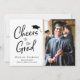 Anúncio de graduação de duas fotos e convite de festas modernos. Na frente, a foto do seu formando está ao lado de "Saúde ao Formando" escrita em um roteiro moderno com um boné de formando no topo. Personalize facilmente com seu nome, ano de aula e escola. No verso, adicione os detalhes da festa de formatura ou da casa aberta e uma segunda fotografia.