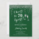 Convite de aniversário de 70. Saúde Para 70 Anos! Design elegante em verde, branco e prata. Apresenta óculos de champanhe, fonte de script e confetti. Perfeito para na moda 70 festas de aniversário. Personalize com seus próprios detalhes. Pode ser personalizado para mostrar qualquer idade.