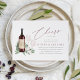 Planejar um chá de vinho ou de casais de vinho ou acolher o grande evento numa adega ou vinhedo? Convide seus hóspedes com nossos elegantes convites para chás de casamento de casais de vinho, com uma garrafa de vinho tinto burgundy e dois copos de vinho, e enfeitiçados com a cor aquática verde folhas de eucalipto e folhagem. "Cheers to Love" aparece na letra de um roteiro de caligrafia. Para um toque final, personalize o rótulo da garrafa de vinho com as iniciais do casal. Perfeito para chás de casamento em vinhas ou em vinhas.
