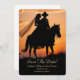 Save the Date! Country western style! A bride and groom ride off into the sunset horseback.
