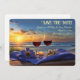 Save the Date beach style with wine! A pretty save the date card with two glasses of wine with a water view as the sunsets.