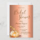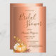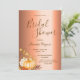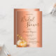 Na frente: Um Chá de panela moderno, elegante e simples para o outono. Um fundo de folha metálica de cobre falsa. Decorado com uma abóbora ouro, folhagem e algumas flores brancas. Modelos para a noiva ser o nome, data e local do chá. O texto: o Chá de panela é escrito com uma escrita de estilo, escrita à mão, com letras castanhas. Fundo: fundo de folha de cobre falso.
