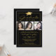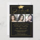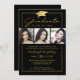 Convite para festa de formatura, preto e dourado, elegante, com 3 fotos quadradas, tipografia moderna com script e um falso boné de formatura metálico de folha de ouro. ASSISTÊNCIA: para obter ajuda com a modificação ou personalização do design, a alteração de cor ou a transferência do design para outro produto, entre em contato com o designer ANTES DE ENCOMENDAR através da guia MENSAGEM de Bate-papo Zazzle ou envie um email para makeitaboutyoustore@gmail.com.