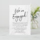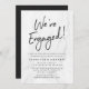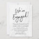 Convites na moda modernos de festas de noivado de casamento com um "Estamos em Movimento" em uma fonte de script de tendências negras, fundo de mármore branco e espaços reservados para suas informações de festa de noivado personalizadas. A parte traseira dos convites de festa de noivado pode ser alterada para uma cor de sua escolha com a ferramenta Personalizar.