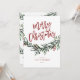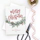 Um cartão festivo, vermelho, verde e branco de natal, de natal, com uma escrita em negrito e verde-aquarela com folhas e bagas. Faz um cartão de saudação pessoal ou comercial excelente para os feriados.